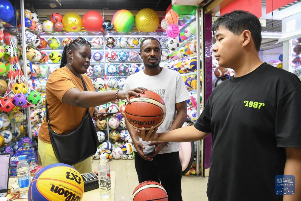 2025年9月15日,外商在浙江省义乌国际商贸城三区商铺洽谈采购球类产品。新华社发(时宽兵摄)