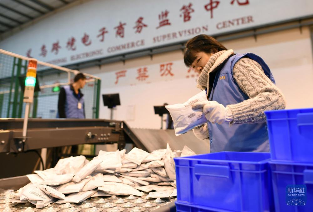 2015年1月13日,在义乌跨境电子商务监管中心,工作人员扫描发往境外的电商包裹。2014年年底,浙江义乌跨境电子商务监管中心正式启用,标志着义乌跨境电子商务出口试点全面开展。新华社记者韩传号摄