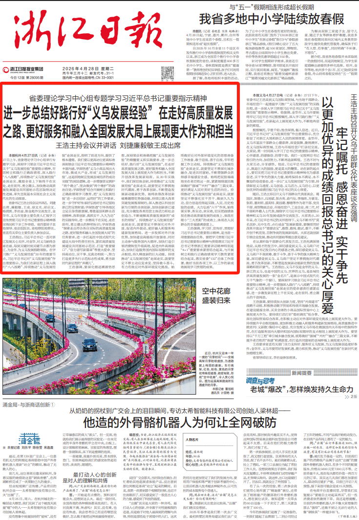 王浩指出,习近平总书记一直对浙江发展关心关怀,对金华、对义乌始终念兹在兹,每到关键时刻关键节点都为浙江、为金华、为义乌发展指路领航。在学习推广“义乌发展经验”20年的重要节点,习近平总书记对“义乌发展经验”作出重要指示,为我们在新征程上深入践行“八八战略”、持续推动“义乌发展经验”走深走实,指明了前进方向、提供了根本遵循。我们要以更高站位更高标准深刻领会习近平总书记重要指示精神的丰富内涵,学深悟透“义乌小商品闯出大市场、做成大产业,形成‘义乌发展经验’,这是因地制宜发展县域经济的成功实践”的深层逻辑,进一步增强坚定拥护“两个确立”、坚决做到“两个维护”的政治自觉;学深悟透“结合开展树立和践行正确政绩观学习教育,把‘义乌发展经验’进一步总结好、运用好”的工作要求,进一步守护好传承好弘扬好总书记留给浙江的宝贵财富;学深悟透“引导各地区立足自身资源禀赋,尊重基层和群众首创精神,改革创新、真抓实干、久久为功”的实践导向,进一步擦亮干在实处、走在前列、勇立潮头的鲜明标识;学深悟透“探索走出符合各自实际的高质量发展之路,更好服务和融入全国发展大局”的任务要求,进一步扛起在中国式现代化建设大局中的责任担当,紧扣高质量发展建设共同富裕示范区、打造“重要窗口”、“奋力谱写新篇章”等重大使命,坚持高站位、实干事、见真功相统一,努力打造更多先行示范标志性成果,勇当新时代新征程的“弄潮儿”。