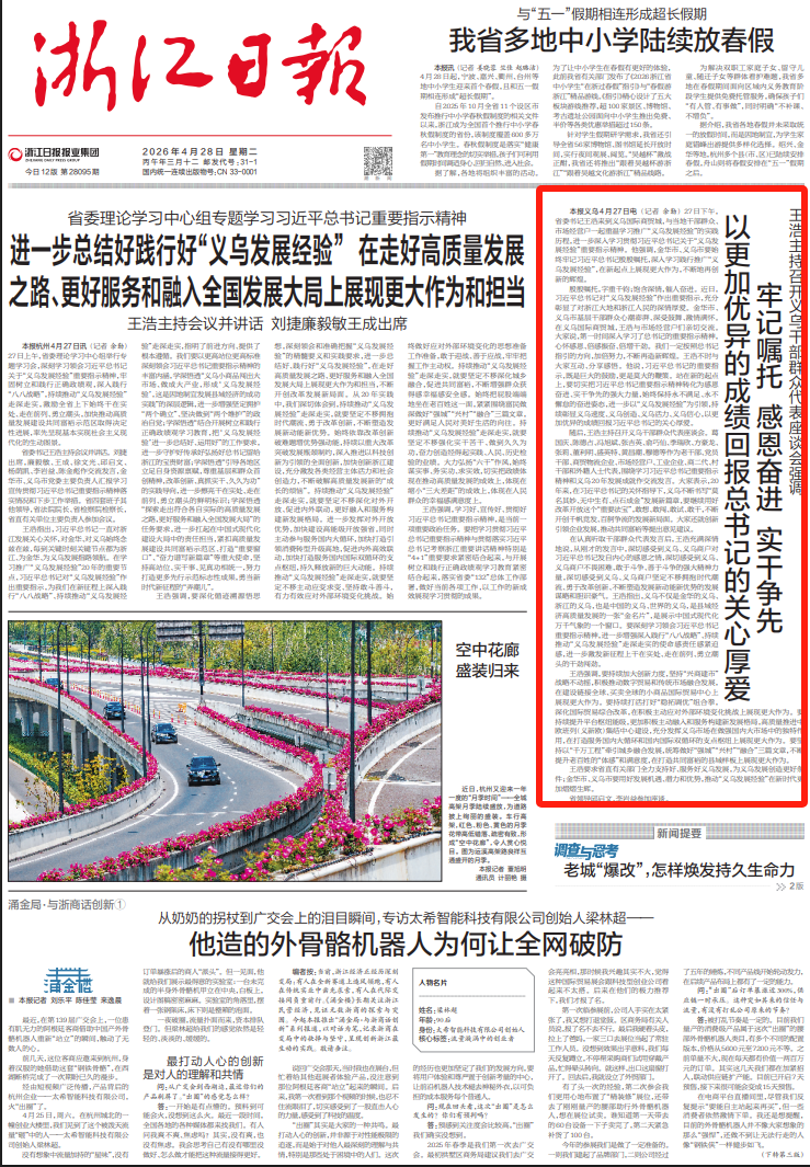 4月27日下午,省委书记王浩来到义乌国际商贸城,与当地干部群众、市场经营户一起重温学习推广“义乌发展经验”的实践历程,进一步深入学习贯彻习近平总书记关于“义乌发展经验”重要指示精神。他强调,金华市、义乌市要始终牢记习近平总书记殷殷嘱托,深入学习践行推广“义乌发展经验”,在新起点上展现更大作为,不断地再创新的辉煌。