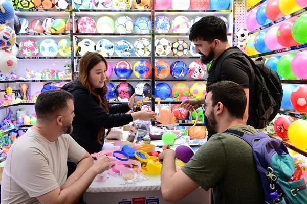 4月26日,浙江金华,在义乌国际商贸城玩具交易区一商铺内,外商洽谈采购遮阳“巴掌帽”出口业务。视觉中国供图