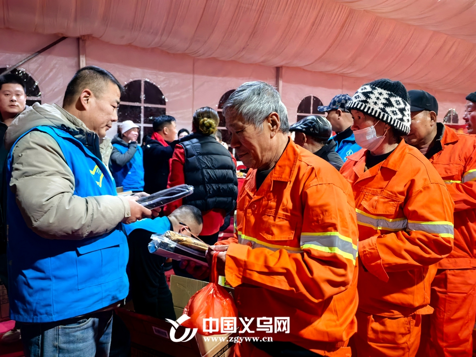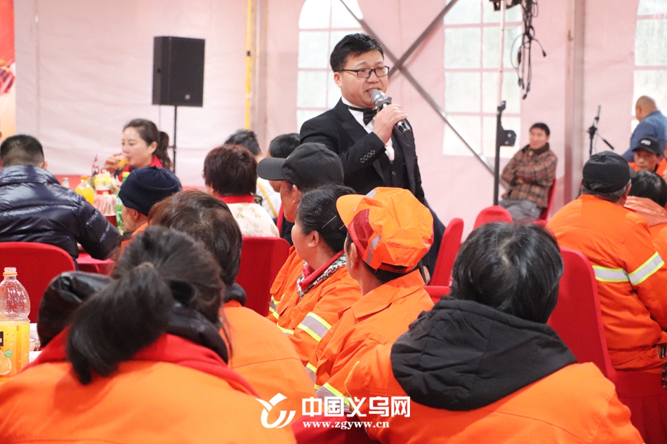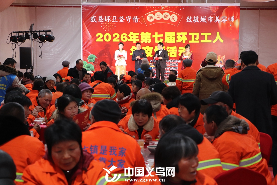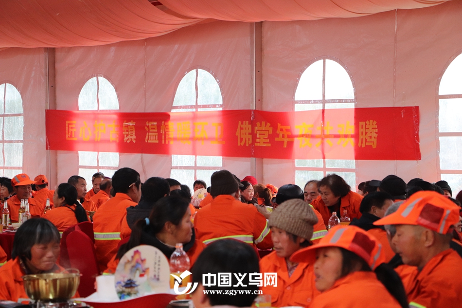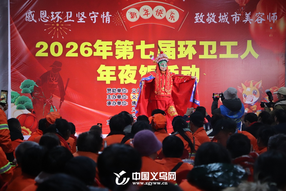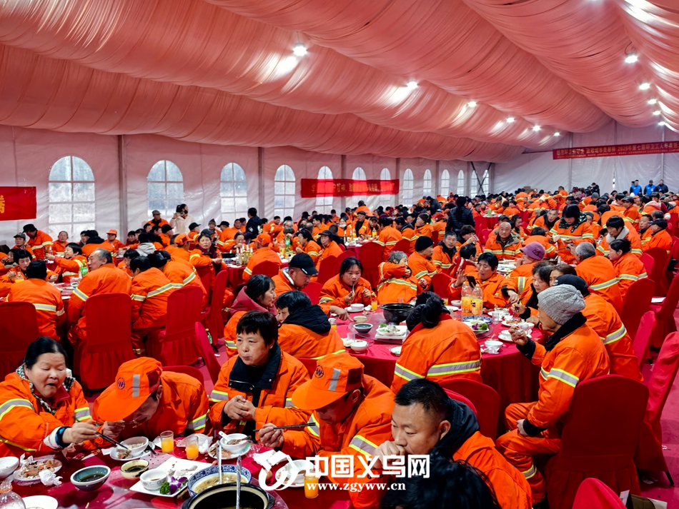 中国义乌网2月2日讯(记者 陈佳琪 编辑 童晓)2月1日晚,“感恩环卫坚守情 致敬城市美容师”2026年第七届环卫工人年夜饭活动在义乌市佛堂镇温情启幕,440名佛堂镇环卫工人与退役军人、志愿者代表近500人欢聚一堂,共品团圆滋味,共迎新春佳节,在欢声笑语中感受来自佛堂镇的暖心关怀。这是佛堂镇连续7年为环卫工人送上的“爱心年夜饭之约”。