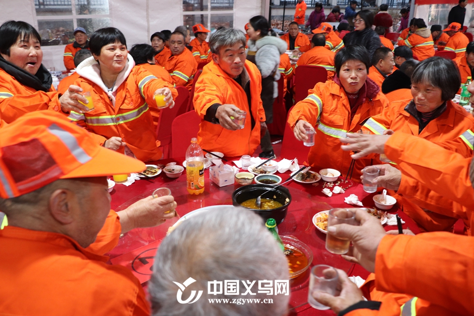 活动现场暖意浓浓,环卫工人身着橙色工作服,围坐在一起,脸上洋溢着幸福的笑容。餐桌上,红烧甲鱼、蒜蓉粉丝鲍鱼、咖喱焗龙虾、炖土鸡、红烧肉馒头等28道菜肴满满当当、鲜香四溢,让大家在舌尖上感受地道的义乌年味。“比家里的年夜饭还好吃,菜多味道不错还热闹,太开心了!”来自安徽的环卫工人李玉芳难掩喜悦,她来义乌二十年、做环卫工两年,这是她第二次参加环卫工人年夜饭,“来到义乌就不想回家了,真想在这里安家。”朴实的话语,道出众多环卫工人对佛堂镇的归属感。