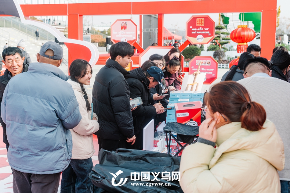 不远处的舞台区,来自义乌市文化馆的文艺志愿者们用歌声与舞蹈为候车旅客驱散疲惫。“公益体彩小知识”互动问答现场,答对问题的旅客收获定制小礼品,更收获了一份关于公益的认知。互动体验区、爱心公益区笑声不断,参与盲盒抽奖的旅客热情满满。带着幼儿返乡的母亲凭车票领到爱心小板凳,连声道谢:“站久了孩子累,这个真贴心!”一旁的义乌体彩中心工作人员细致地整理着福袋,每个福袋里,由义乌宝娟年画准备的定制春联、年画、挂历承载的不仅是节日祝福,更是这座城市对建设者的致敬与感谢。