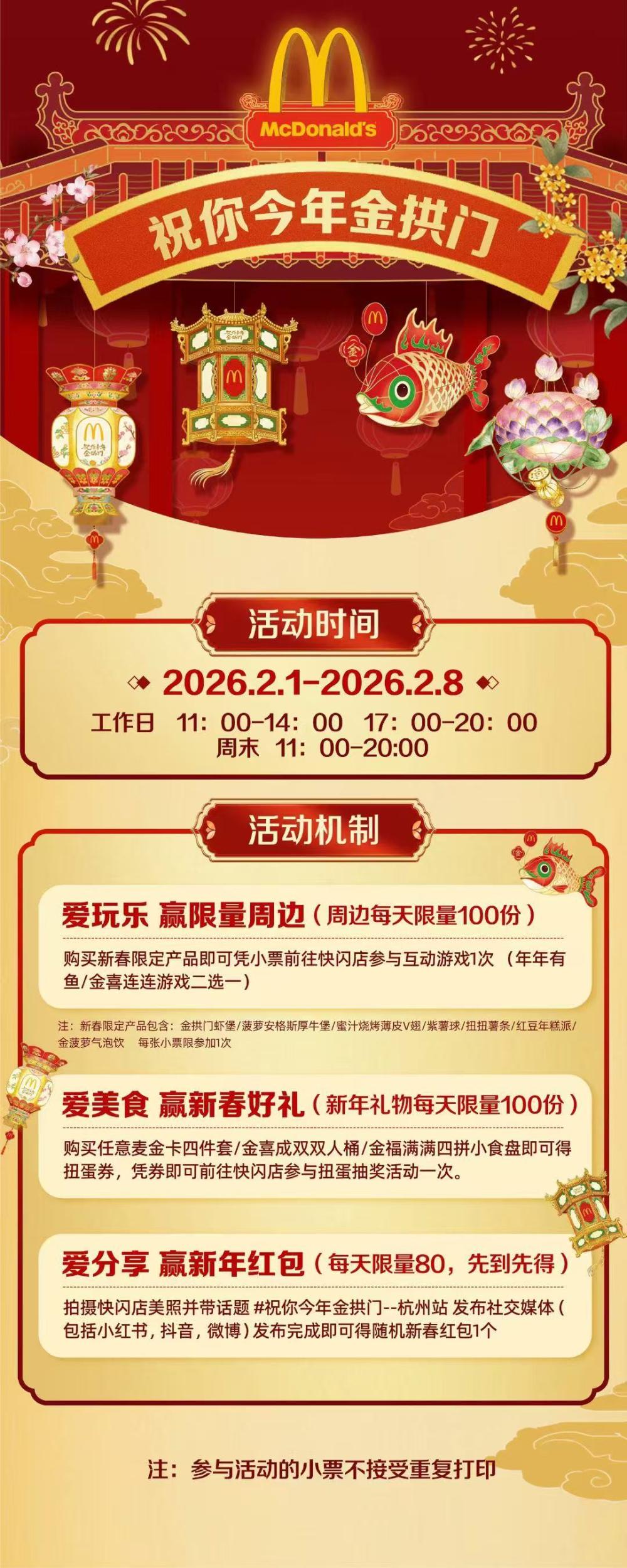 2月1日至2月8日,杭州开启“祝你今年金拱门”新春快闪活动
