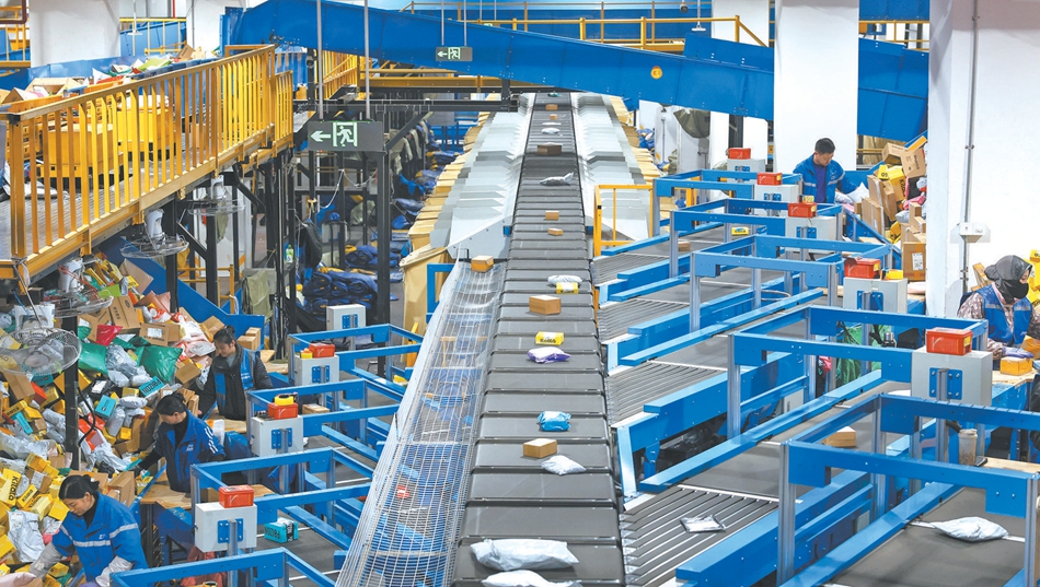 据悉,春节期间,全市11个主要品牌分拨中心、270个营业网点及54个快件小型处理场所持续运营,有效支撑了电商“不打烊”模式,确保了基本收派服务需求。图为中通快递新科网点正在分拣快递。